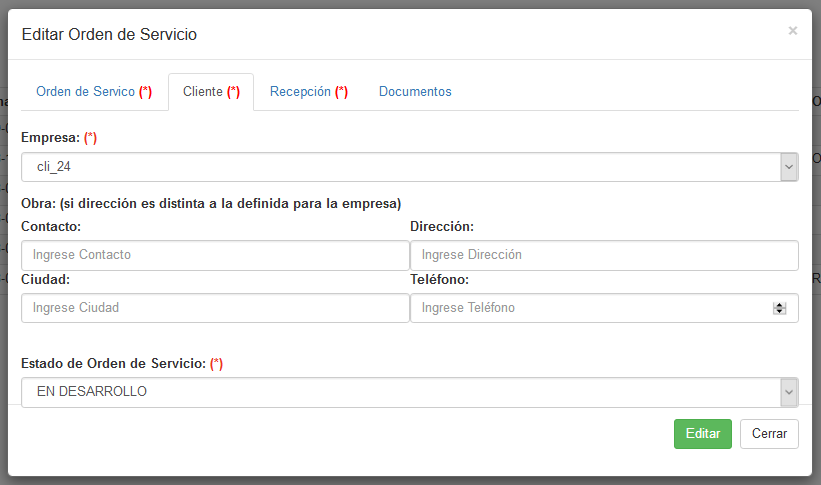 Fig 553 Ventana emergente para ingreso de Orden de Servicio, pestaña Clientes