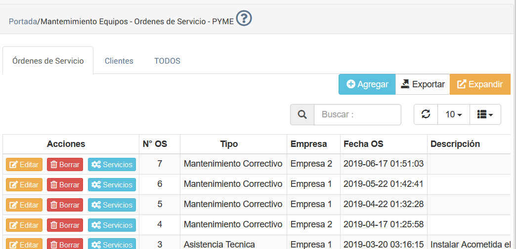 Pestaña de Ordenes de Servicio empresa PYME