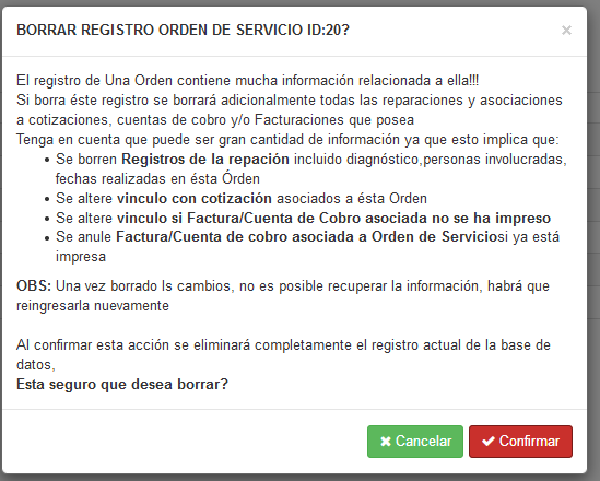 Fig 540 Ventana Emergente que advierte acciones que se realizarán si se borra Orden de Servicio
