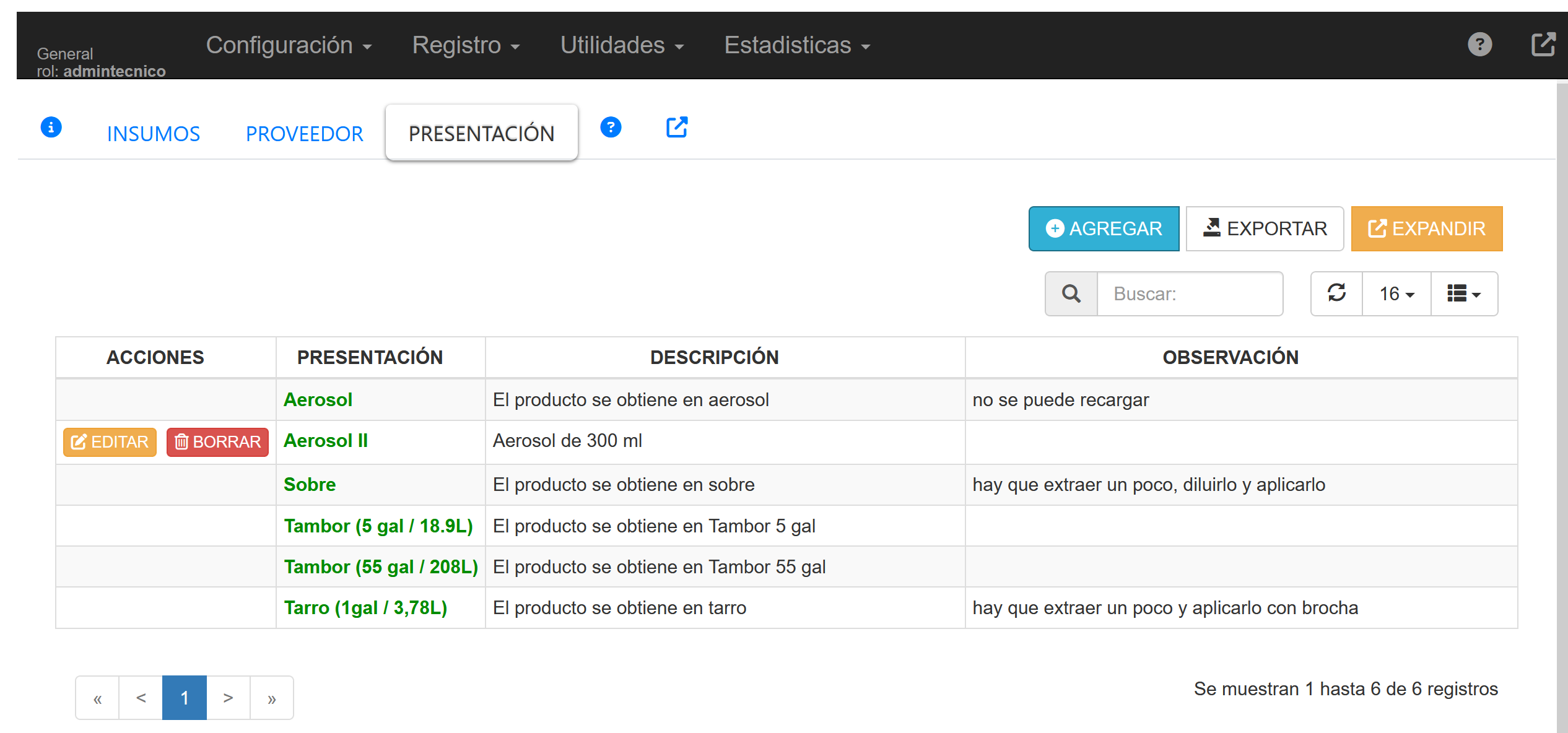 Fig 766 Extracto de pantalla, listado de presentaciones definidos para insumos