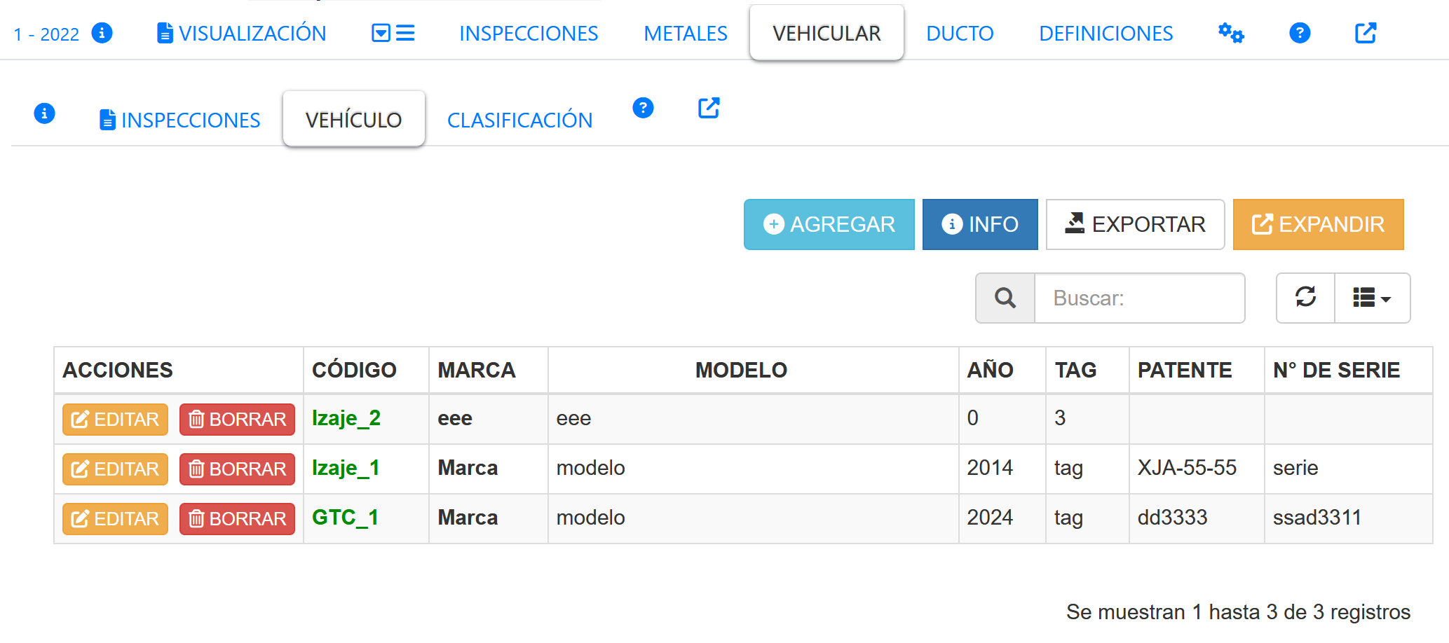 Al seleccionar la pestaña VEHICULOS, se mostrará un listado de los vehículos definidos en el sistema. tal como se muestra en la siguiente imagen