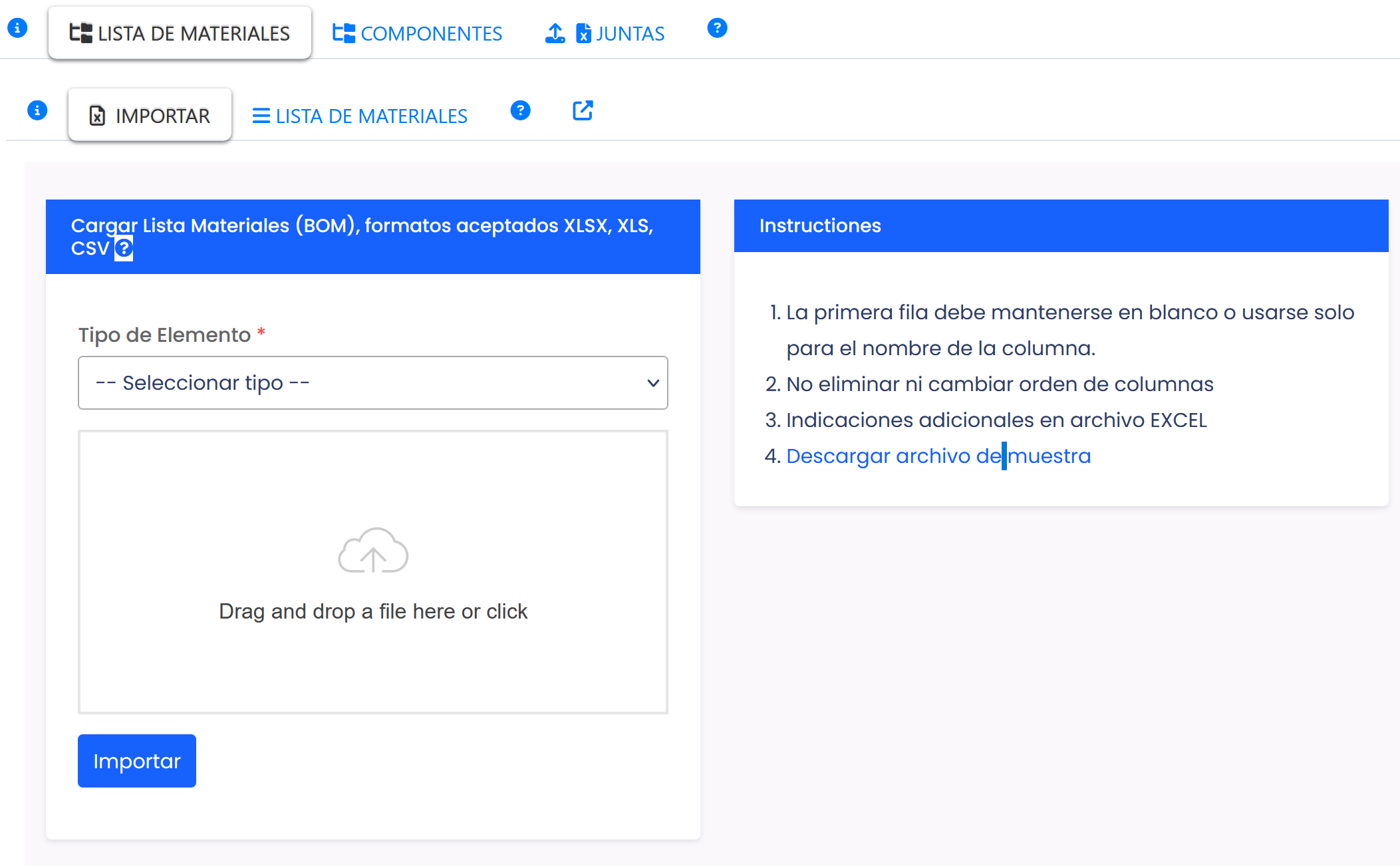 Pestaña importar lista de Materiales