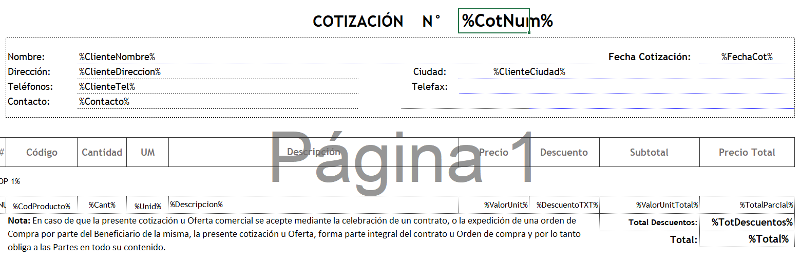 El formato del documento plantilla de Cotizaciones es un documento generado a su gusto que contiene una serie de variables, las cuales son reemplazadas por valores de la cuenta de cobro en Particular.