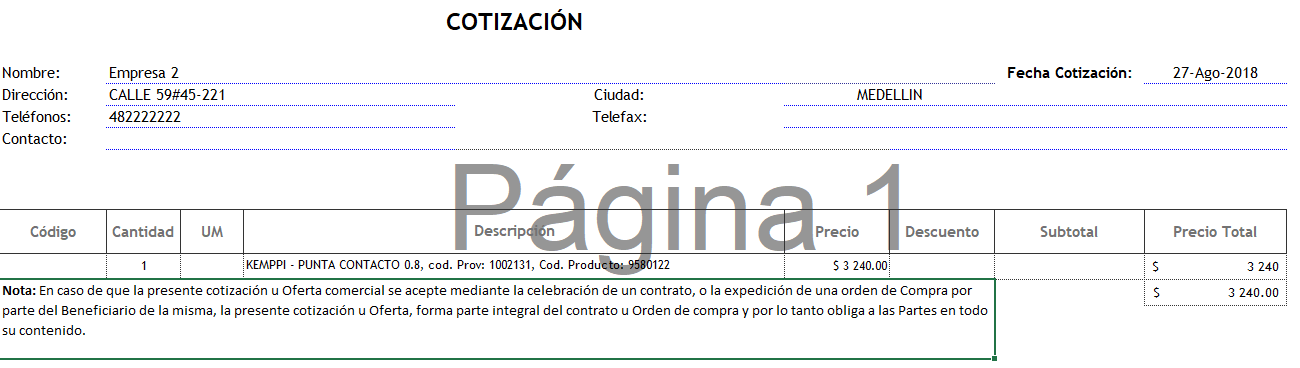 Fig 977 Ejemplo archivo de salida de Cotización en base a una plantilla definida anteriormente en Fig 1.