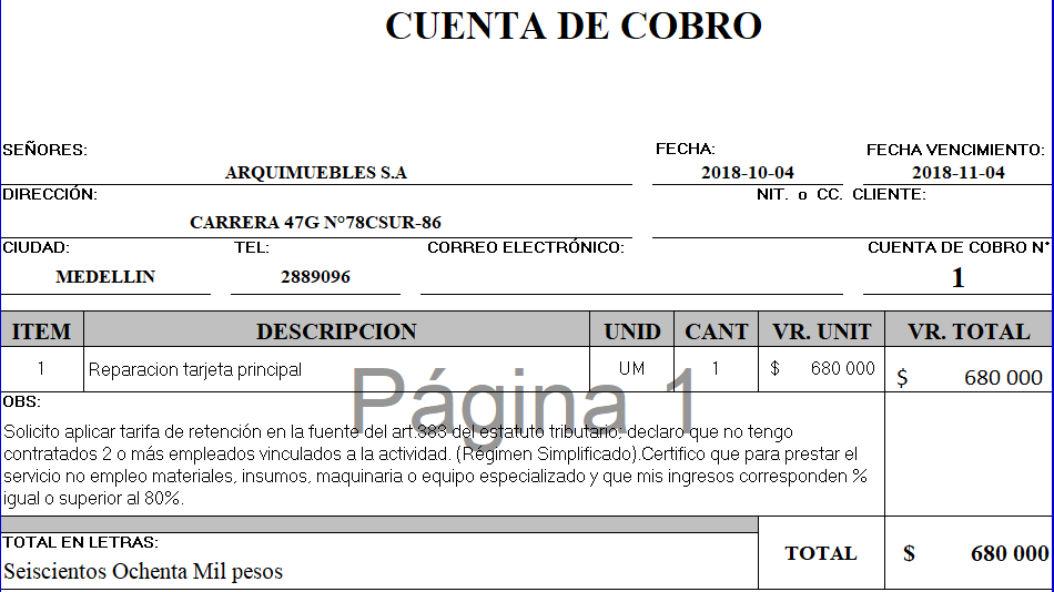 Fig 979 Ejemplo archivo de salida de Cuenta de Cobro en base a una plantilla definida anteriormente en Fig 1.