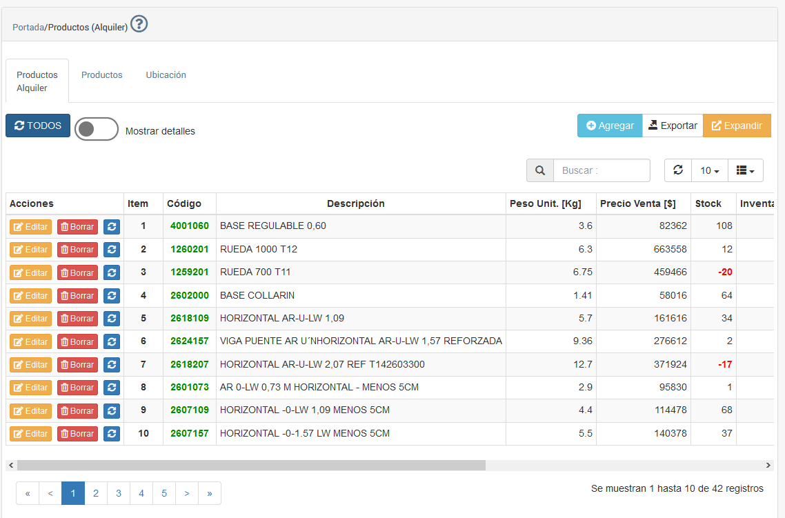 Todos Permite actualizar y visualizar el detalle de todos los productos en Alquiler es una opción que toma más tiempo.