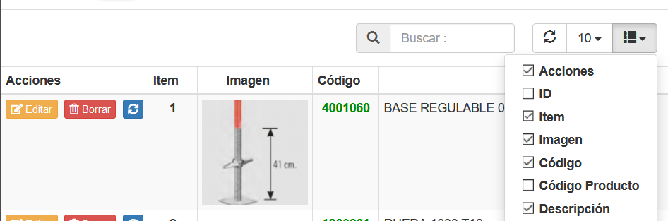al activar la opción Imagen de las opciones de visualización de columnas de la tabla (situado en el extremo superior derecho), aparecerá en la columna "imagen" una imagen del producto respectivo, tal como se muestra a continuación.