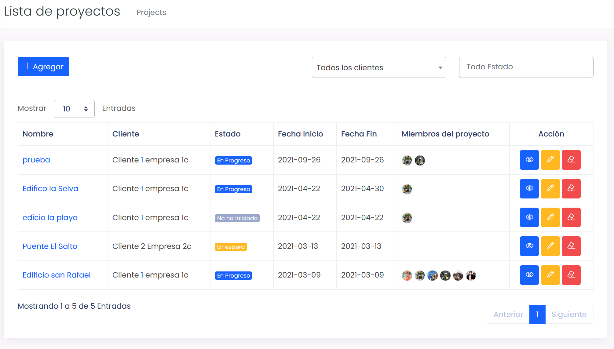 Al seleccionar la opción de menú Proyectos, aparecerá una imagen tal como se muestra a continuación
