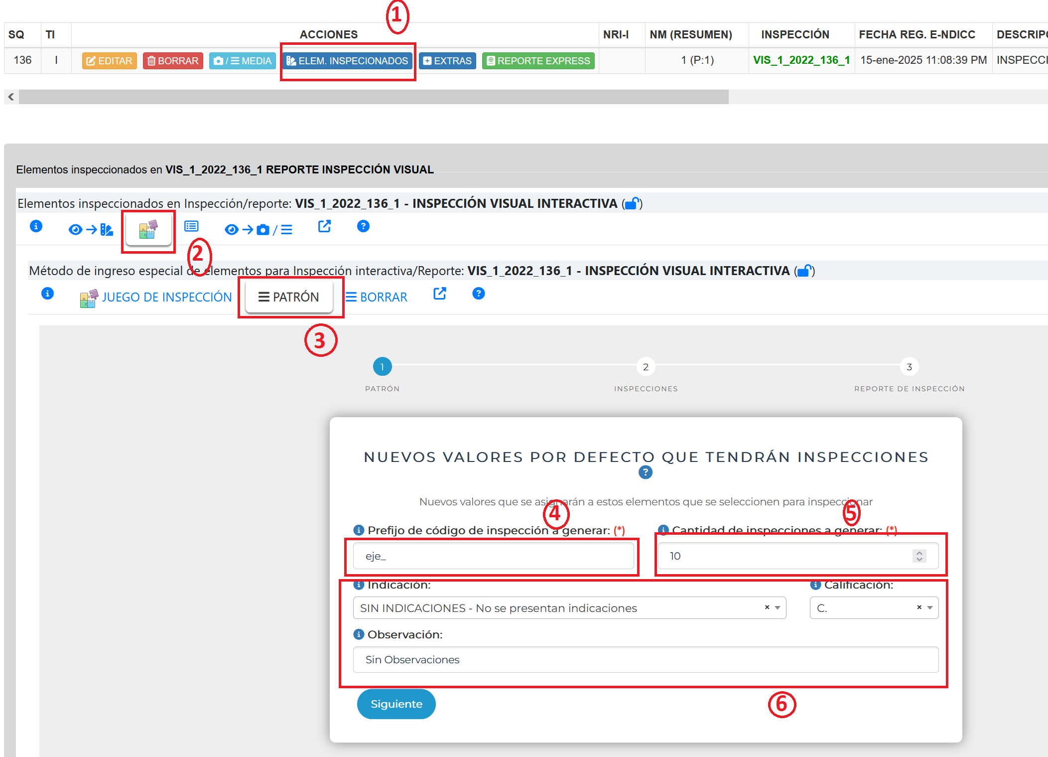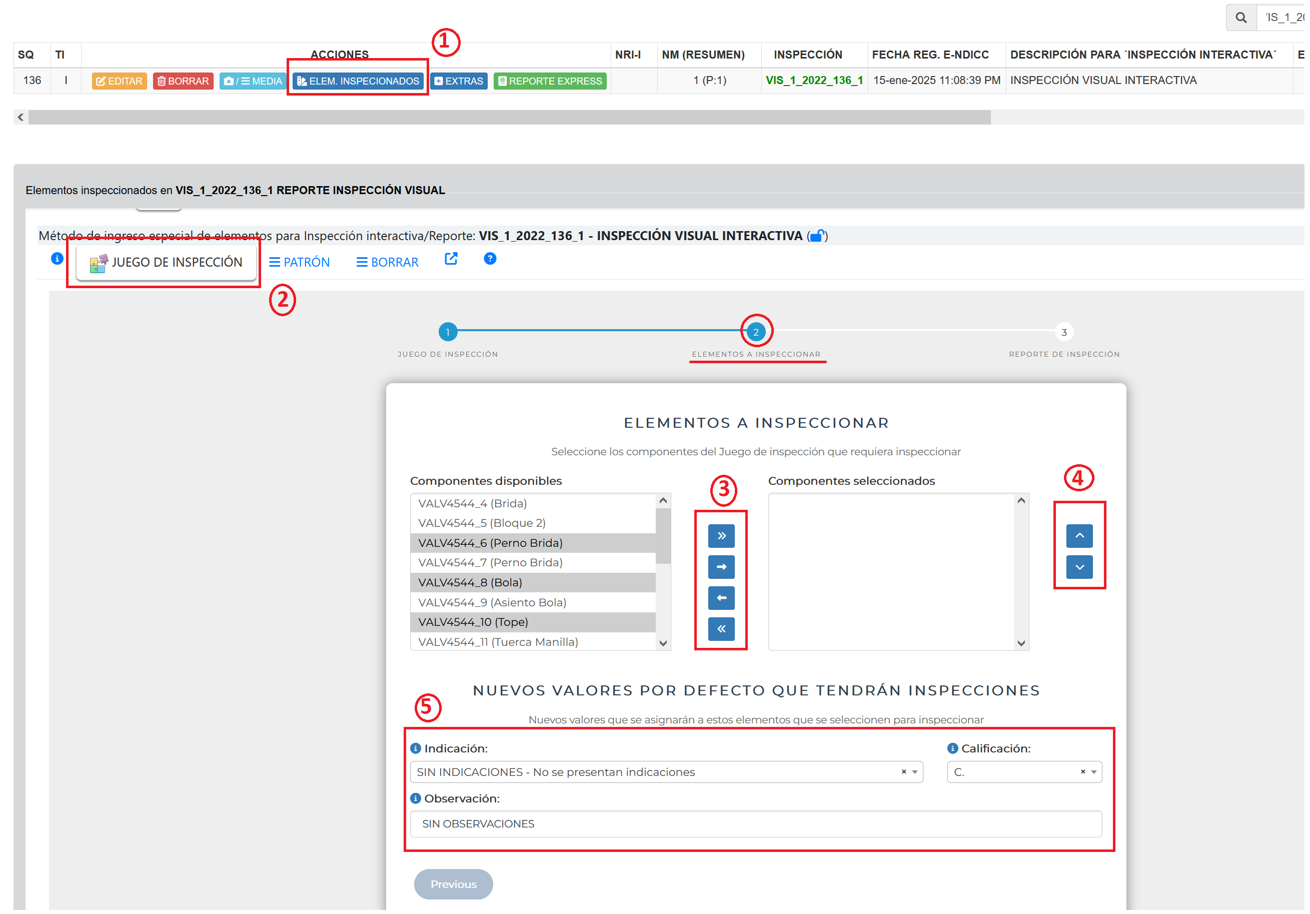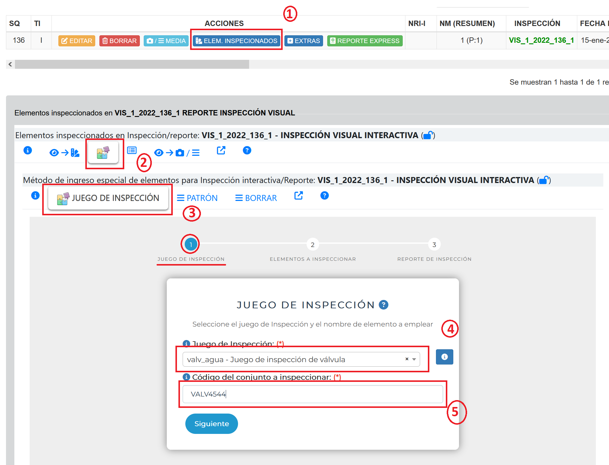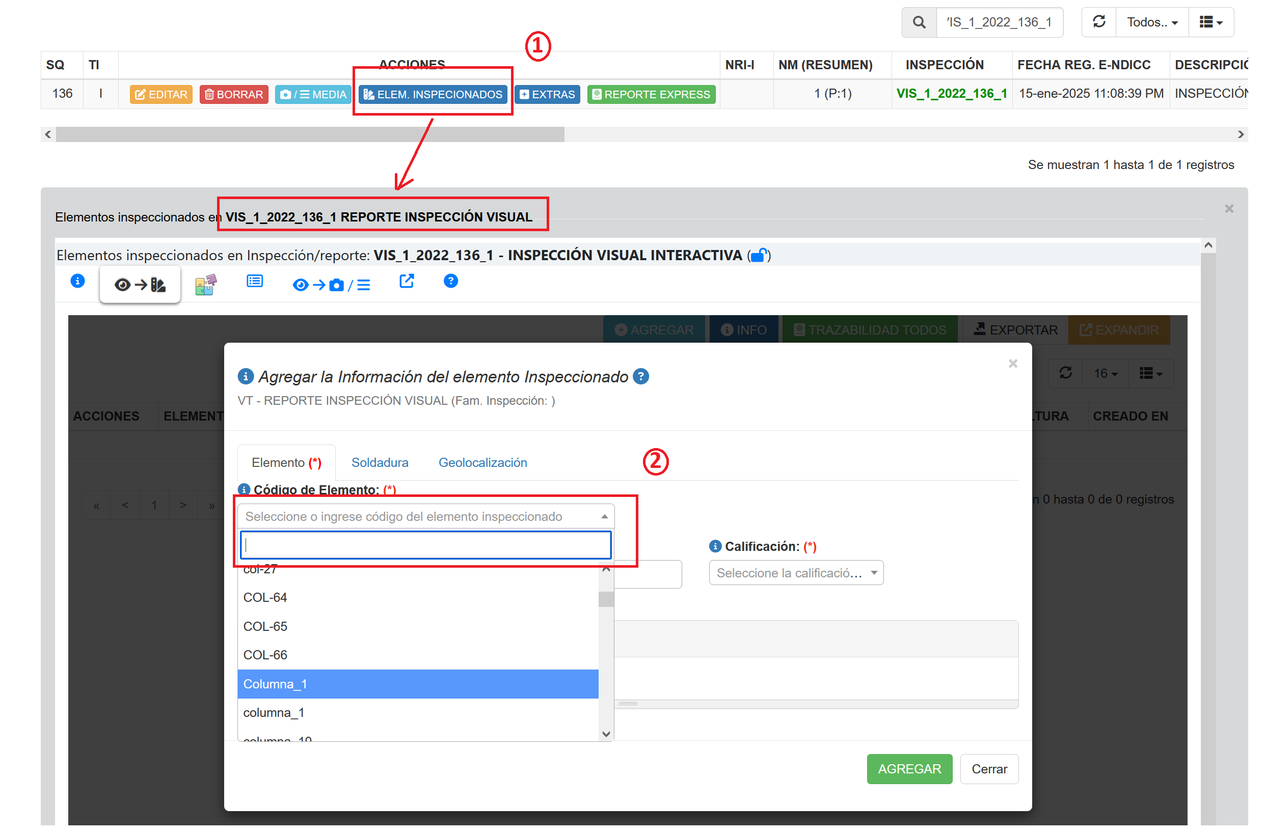 cada vez que se realiza la inspección el sistema permite agregar elementos inspeccionados en el reporte (1) y al agregar la inspección puede Ingresar o seleccionar elementos (ya antes definidos en la inspección (2)