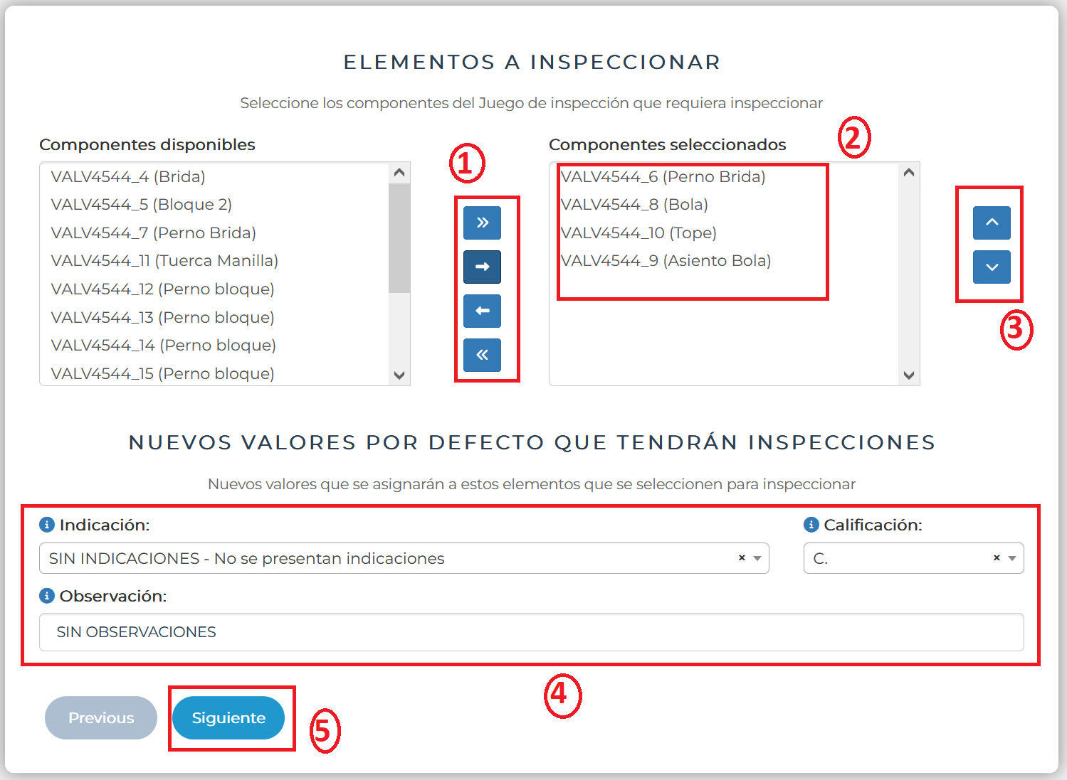 oel asistente buscará los elementos constitutivos del juego de inspección y le dará a escoger si quiere usar todos o algunos.