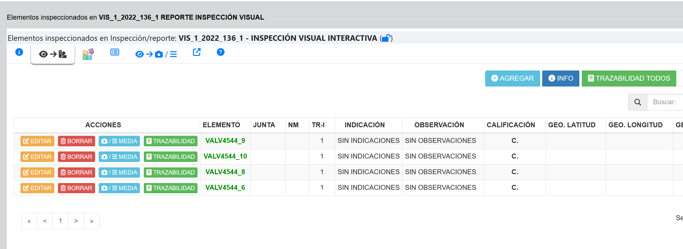 En la imagen anterior se observan ya los datos ingresados en el reporte de campo. El código del elemento generado VALV4544_9 corresponde al conjunto VALV4544 y el 9 componente del juego de inspección
