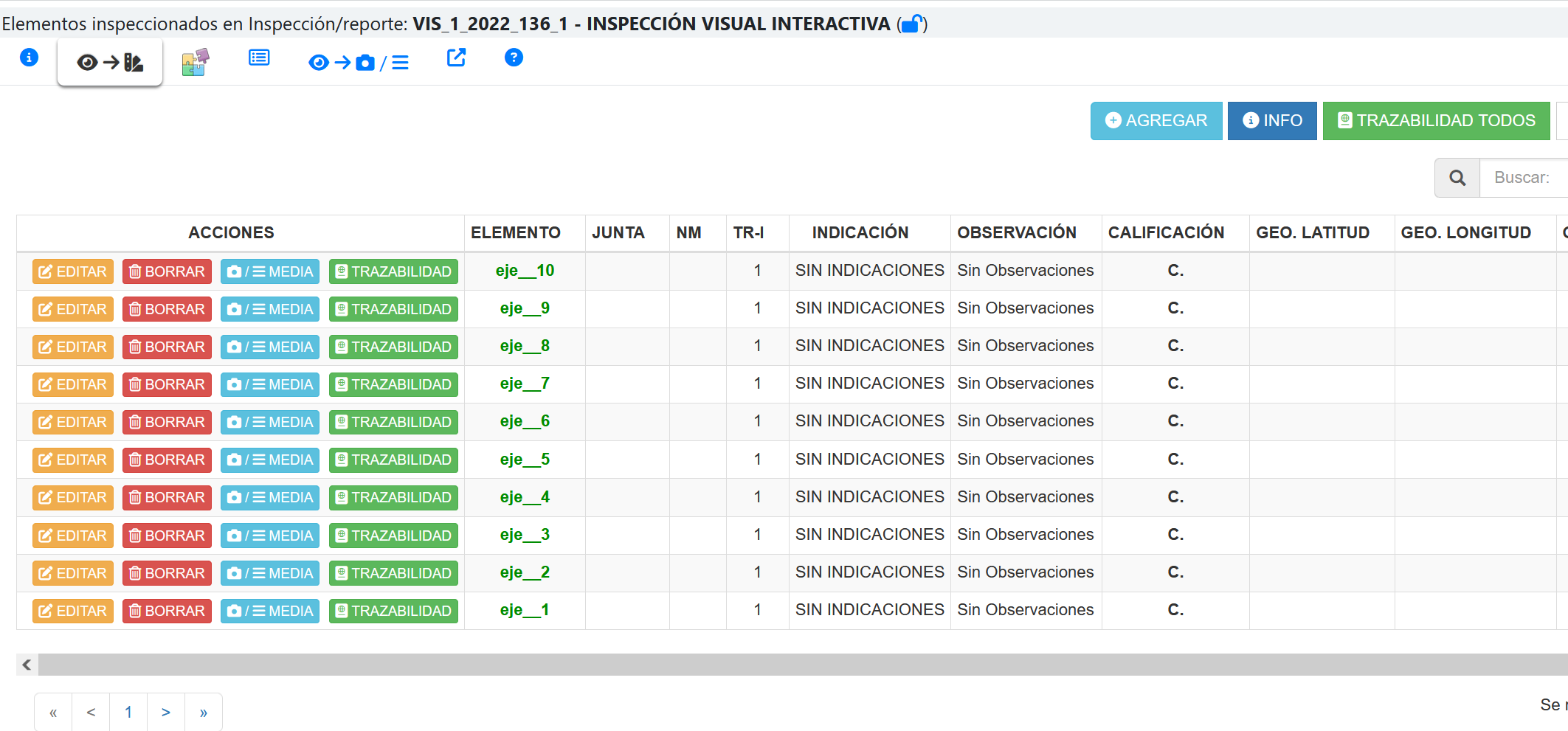 Ilustración 24 Extracto de pantalla con elementos ya ingresados al reporte de acuerdo a componentes de juego de inspección, instanciados al elemento a analizar.