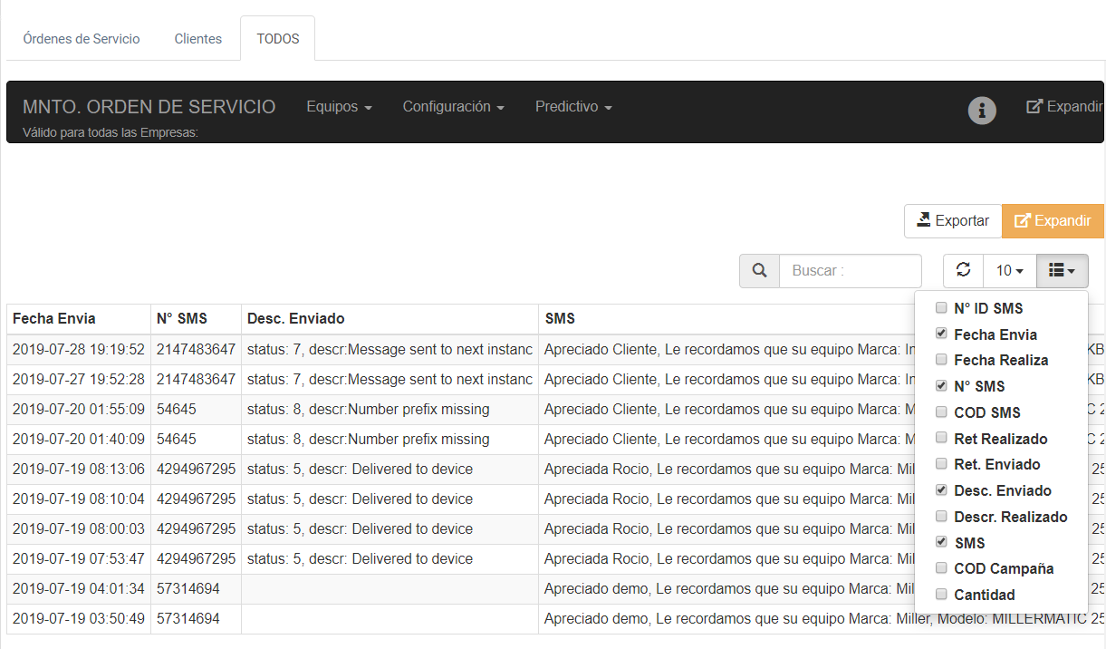 Al seleccionar esta opción se genera un listado de todos SMS enviados. Esto es de particular interés para poder tener un control de información enviada al cliente.