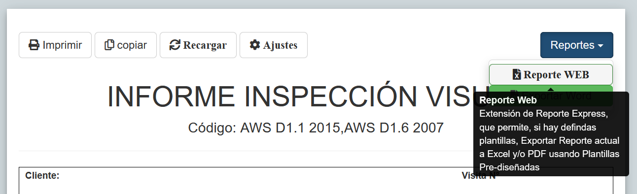 Si está opción está activa, se notará por la presencia de un botón "Reporte Web", todos los datos recolectados en la inspección se traspasarán al la plantilla de Reporte Web respectiva (ver Plantillas Reportes WEB). De esta manera, se emplean los formatos de la empresa para generar reportes con puntos ingresados directamente desde dispositivos móviles.