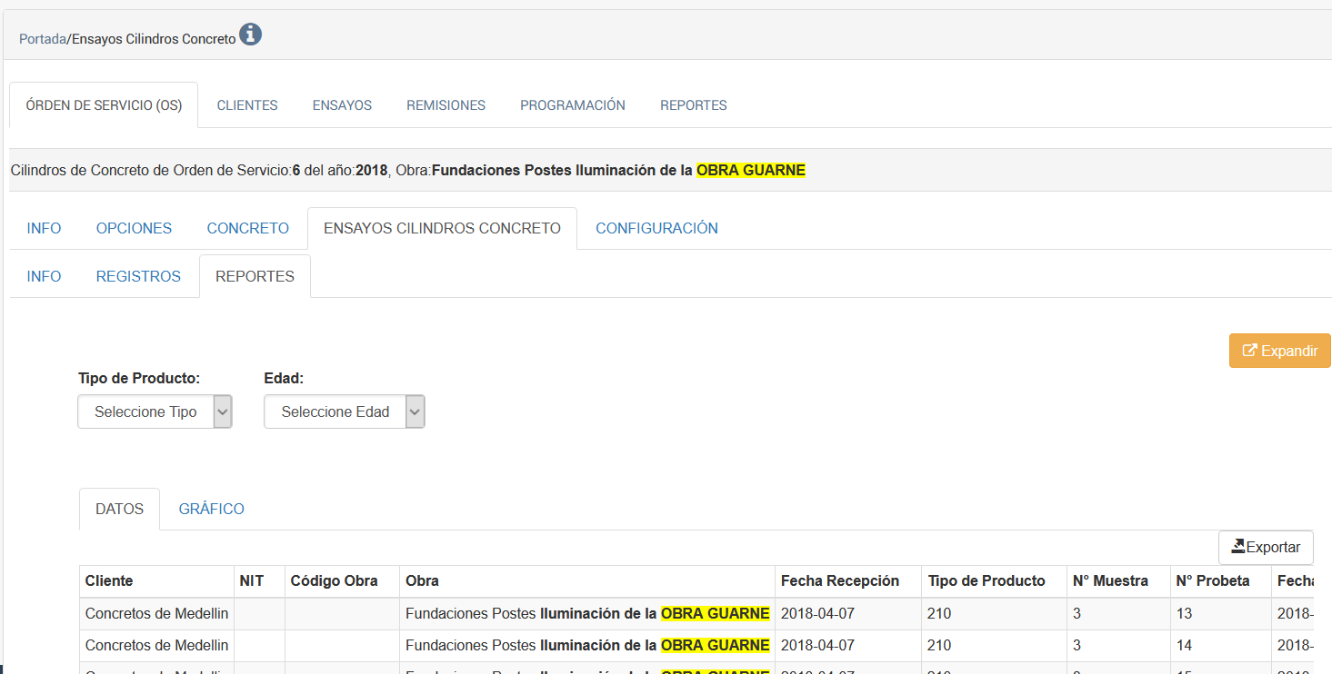 PESTAÑA OPCIONES ENSAYOS DE CILINDROS DE CONCRETO/REPORTES DE ENSAYOS