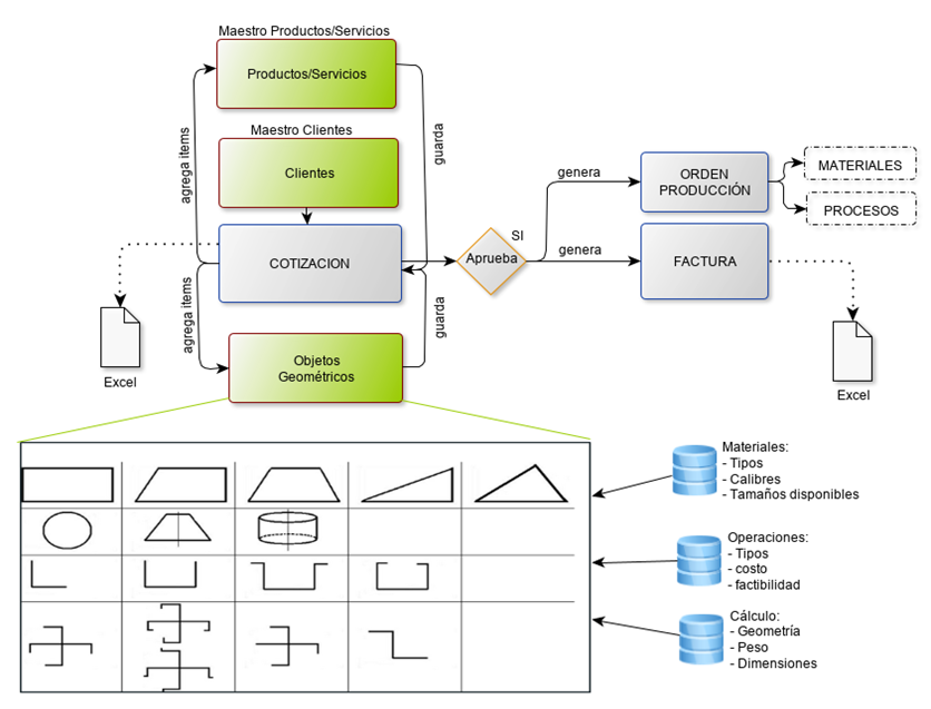 Teniendo en cuenta estos aspectos mencionados, el sistema permite determinar el costo del elemento a producir. Este tipo de proceso posee la siguiente característica, se cobra por producto elaborado pero el producto puede tener procesos asociados a ello. El Cotizador posee un filtro que permite visualizar una cotización que contempla en forma separada todos productos a fabricar y sus respectivos procesos o el costo del producto consolidado. ver más detalles en el Cotizador. El Cotizador posee una interfaz gráfica que permite seleccionar su geometría y con ello su desarrollo, seleccionar de láminas posibles de acuerdo a tipo de equipos que posea la empresa y restricciones propias de procesos.