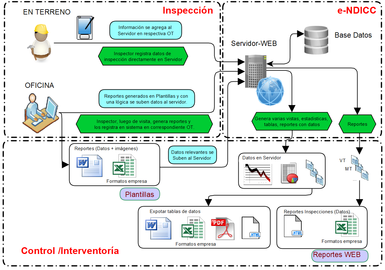 El Sistema e-NDICC representa la solución a tal problema, es una solución en la web que interactúa con la información entregada por inspectores. El inspector puede alimentar el sistema mediante reportes en Office (Excel y Word) y/o en tiempo real en línea mediante un teléfono inteligente.