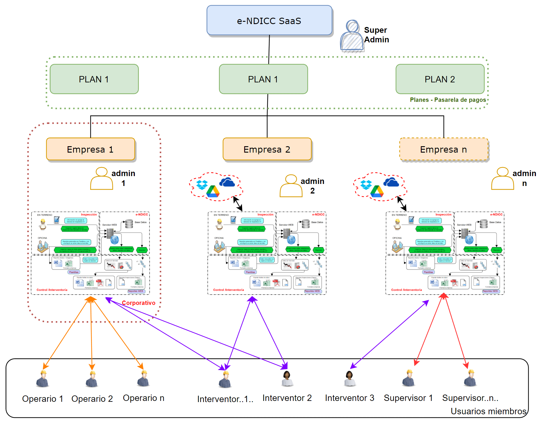 El sistema e-NDICC-ERP permite ejecutar el sistema e-NDICC sobre una plataforma SaaS, bajo un modelo en que el usuario define que plan usará de acuerdo a tamaño de su empresa, proyectos y clientes.