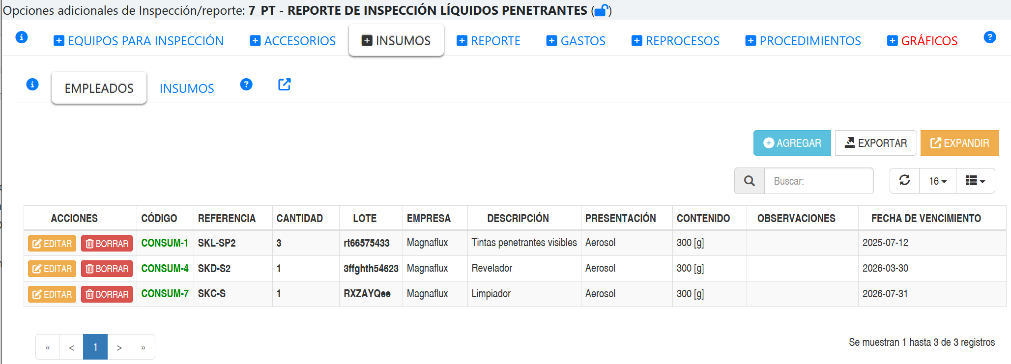 Importante mencionar que los insumos disponibles están asignados por tipo de reporte. Es decir, un aerosol de líquidos penetrantes estará solamente disponible para reportes del tipo líquidos penetrantes solamente.