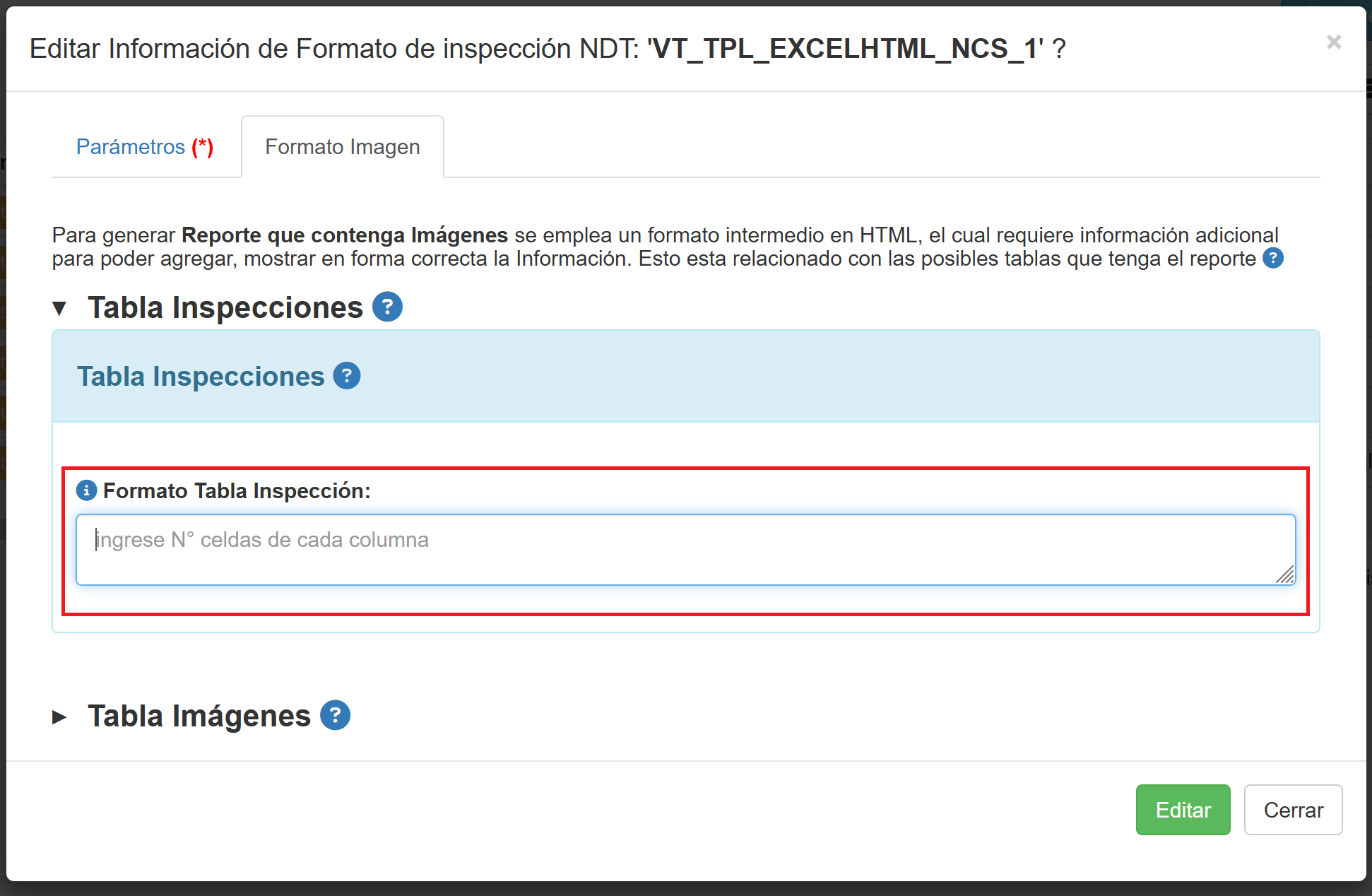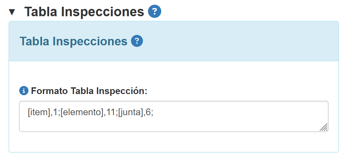Al expandir la opción de Tabla de inspecciones en Reportes con imágenes, aparece un recuadro donde hay que ingresar un formato de la tabla de inspecciónes. Tal como se muestra en la imagen siguiente.