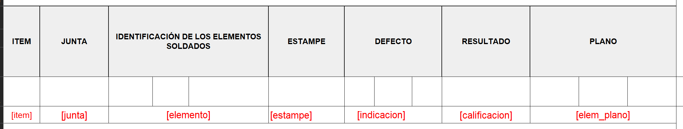 En esta imagen es posible apreciar el encabezado de la tabla de inspecciones y en rojo las respectivas variables tipo [xx] del mapa de variables. También es posible apreciar que no todas las columnas tienen el mismo tamaño, por lo que hay que detallar como se logra ese tamaño.
