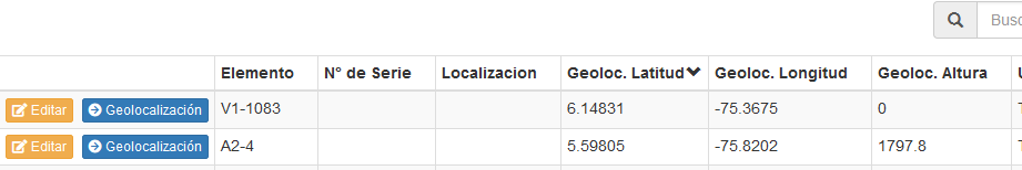 Fig 344 Captura de pantalla, Tabla de datos indicando aquellos elementos que poseen Geolocalización, extraído de Tipificación de elemento Inspeccionado.