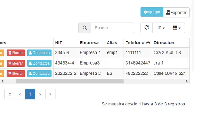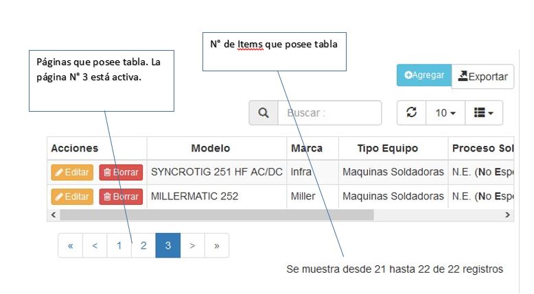 Si una tabla tiene muchos registros y se ha optado por la opción diferente de “todos” en la parte inferior de la tabla a la izquierda se verá una regla que indica el número de página que se está mostrando y a su derecha la cantidad de ítems que se posee dicha tabla. En la imagen actual la tabla muestra el 3 y posee una representación de 10 elementos por página. Por lo tanto la 3 página representará de los elementos 21 al 30. Como indica 22, la tercera página solo mostrará 2 elementos.