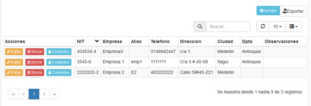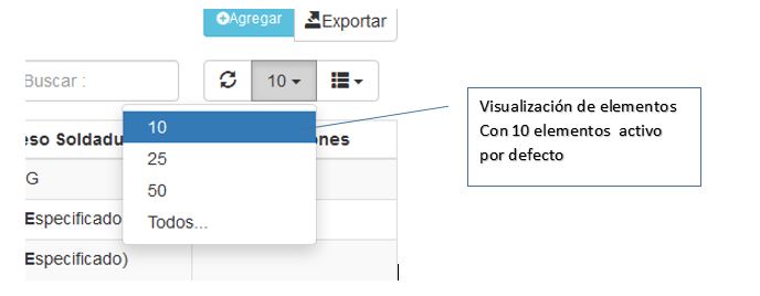 Elementos: Determina el número de elementos (filas) que se desplegaran en una página, útil si hay muchos registros, por rapidez 10 es adecuado, otros valores 25, 50 o todos,
