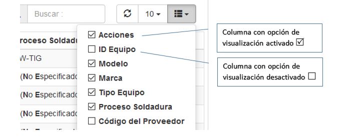 Columnas: Permite determinar que columna se puede visualizar. Al presionar este botón, aparece una ventana emergente con todas las columnas que la tabla puede desplegar, con una opción de marcar la casilla. Si la casilla está marcada ☑ esta columna será visualizada en la tabla. Por el contrario, si la opción no está marcada □ esta columna no será visualizada en la tabla. Por espacio o conveniencia uno puede determinar que columnas puede visualizar.