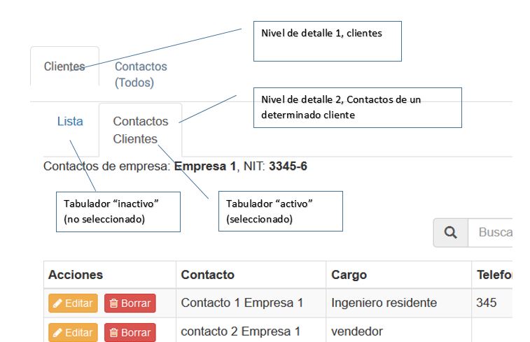 Otros botones puede realizar otras acciones especiales, en la imagen superior, el botón "CONTACTO" detallará los contactos que pueda tener un determinado cliente. En este caso se emplea el elemento gráfico "PESTAÑA" para separar grupos de información. En la siguiente imagen se aprecian tanto los niveles de detalle luego de seleccionar un determinado cliente, se muestra sus contactos. y se visualizan también las pestañas activos e inactivos.