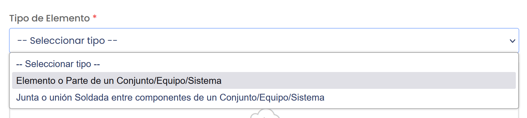 Dependiendo del Elemento a inspeccionar se puede determinar el tipo de elemento que tendrá la lista de materiales, esto se hace a través de un cuadro de selección tal como se muestra en la siguiente imagen.