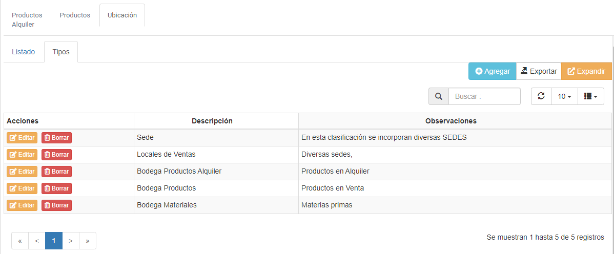 Al presionar la pestaña TIPOS aparece una tabla de datos con el detalle de tipos de Ubicación, tal como se muestra en la imagen a continuación