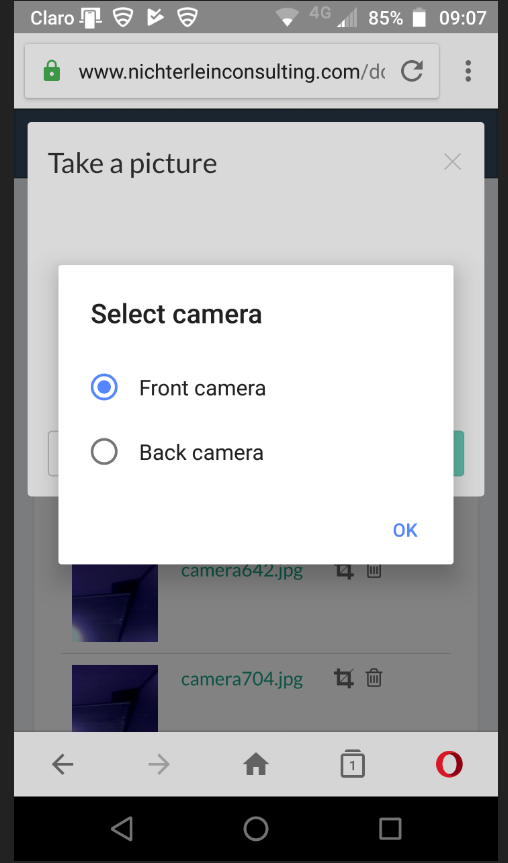 Al presionar el botón "CAMARA" se presenta una ventana emergente con la imagen que capte el dispositivo directamente. Si el dispositivo posee 2 cámaras aparecerá una ventana que pregunte cual emplear, luego de seleccionar la cámara, se puede proceder a tomar la foto.