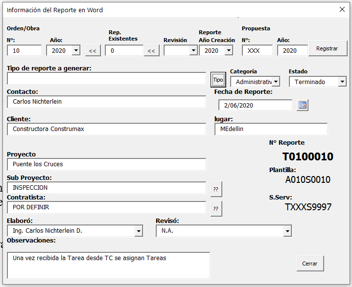 Rep. Existentes: Indica el numero de reportes que están definidos en la obra con objeto de establecer el número del reporte.