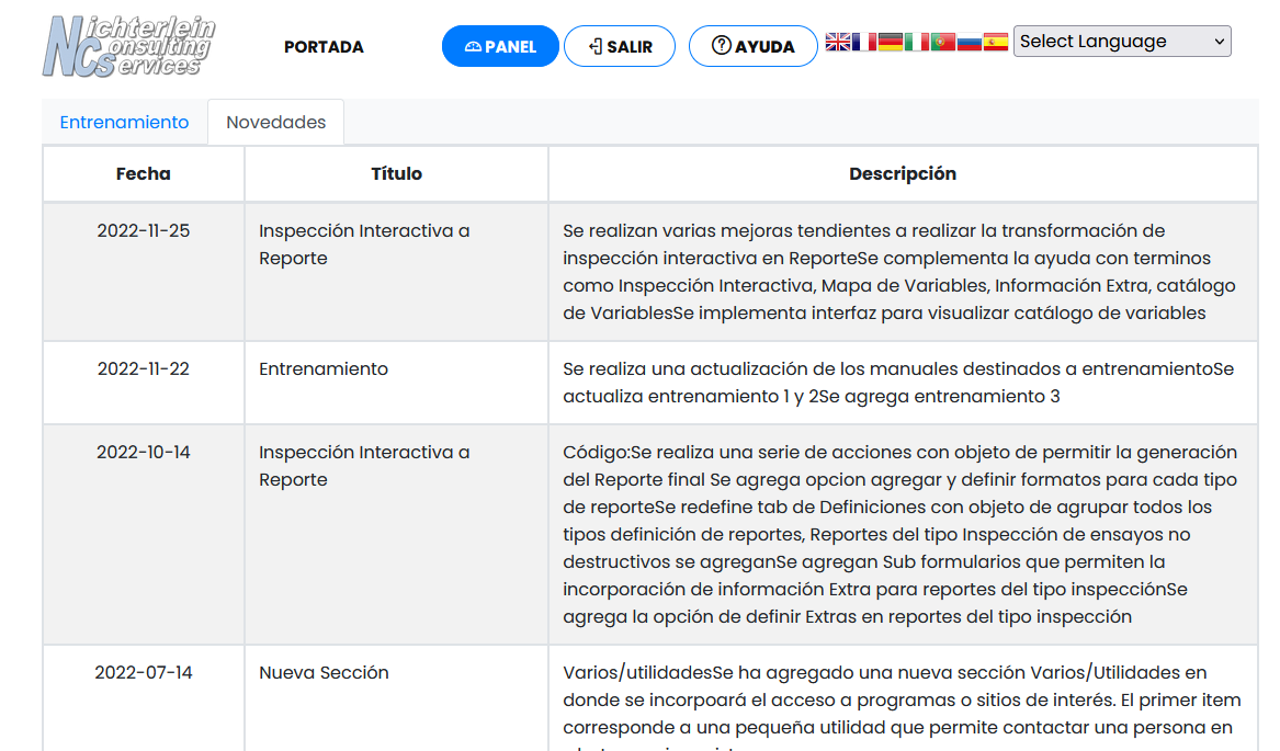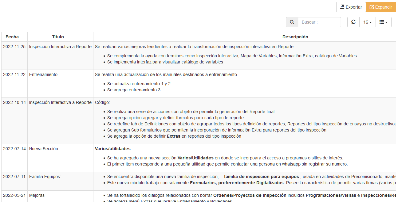 Fig 775 Extracto de pantalla con listado de Novedades de funcionalidad de e-NDICC-ERP.