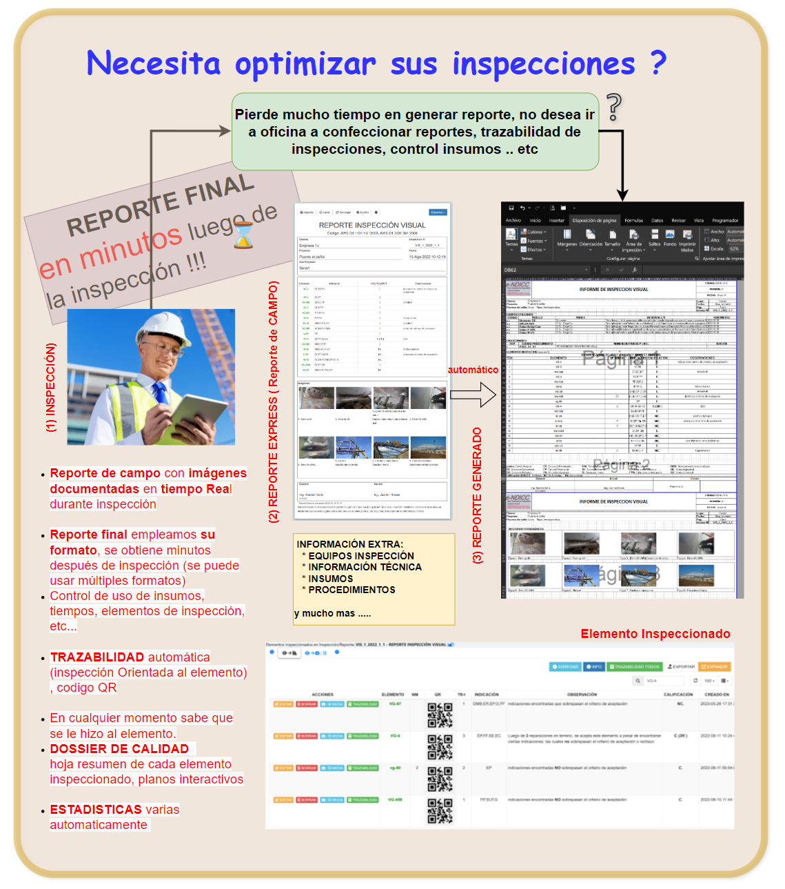 - Trazabilidad de inspecciones al 100%, lo que permite un mejor control al momento de liberar elementos