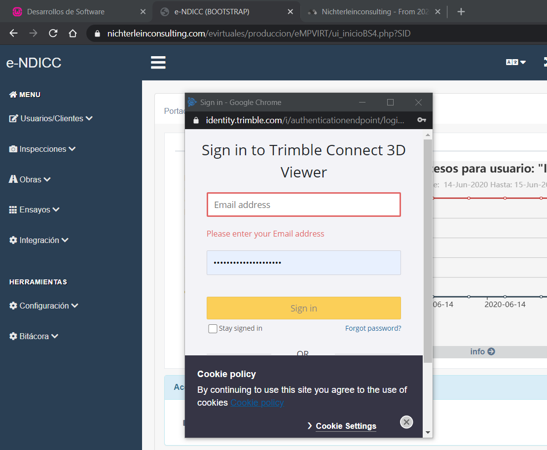 El visor de Trimble connect exige que el al inicio el usuario se valide en su plataforma. Para tal efecto es necesario