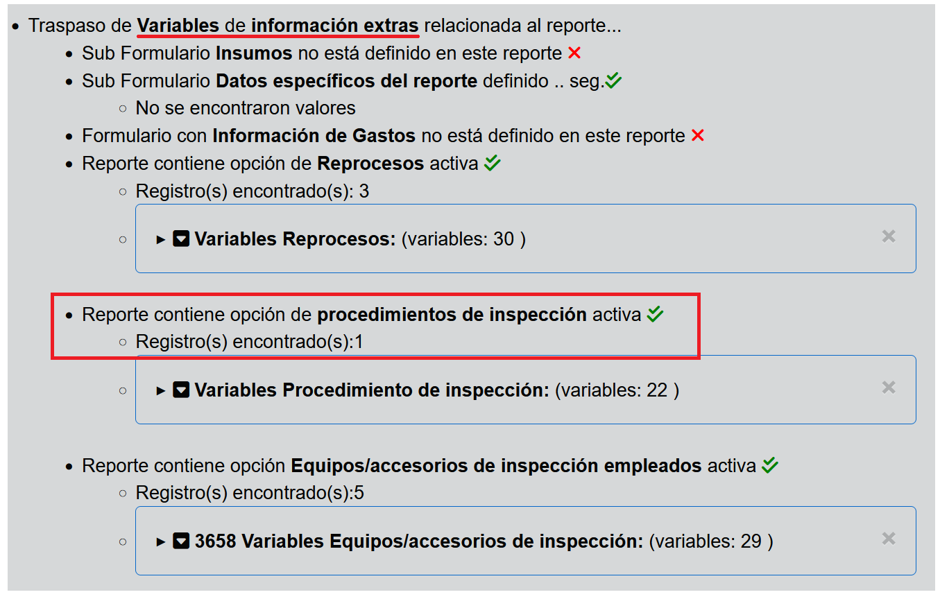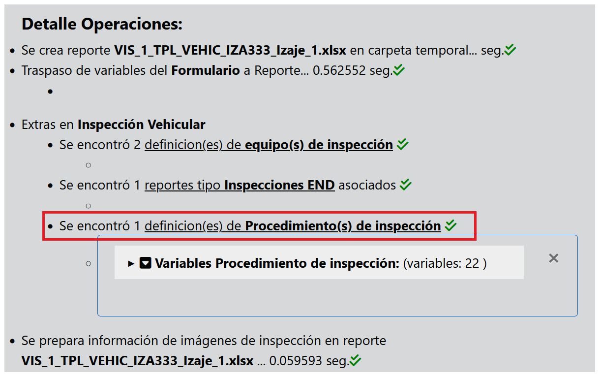 Durante la generación del reporte final se podrá visualizar si la opción de procedimiento de inspección se está ejecutando por el hecho de que el sistema verifica si se han definido procedimientos para este reporte.