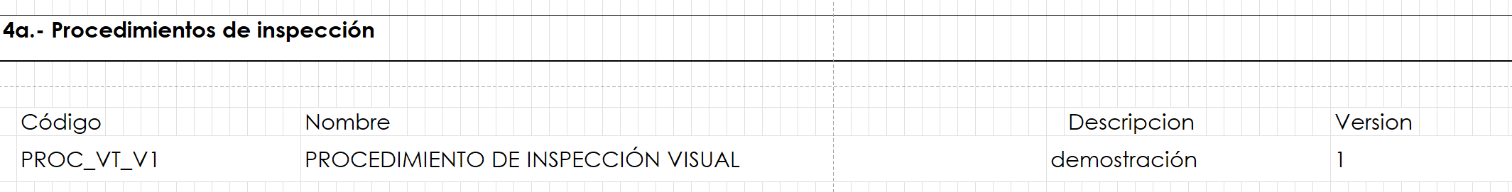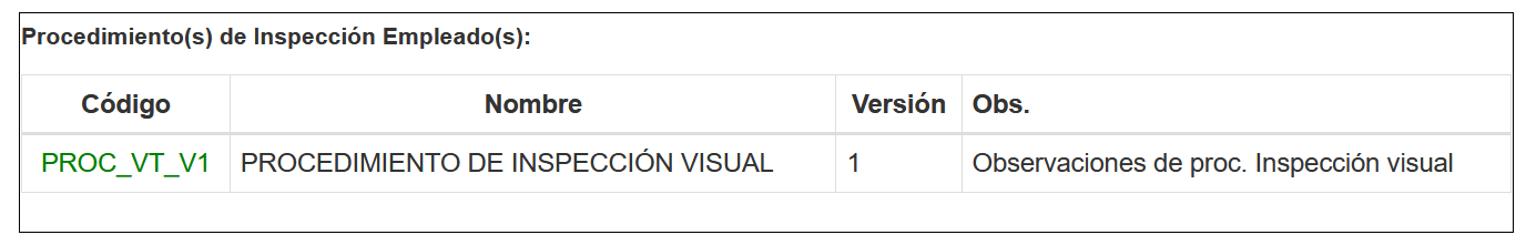 Fig 1242 Visualización de Procedimiento de inspección empleados en reporte activo.