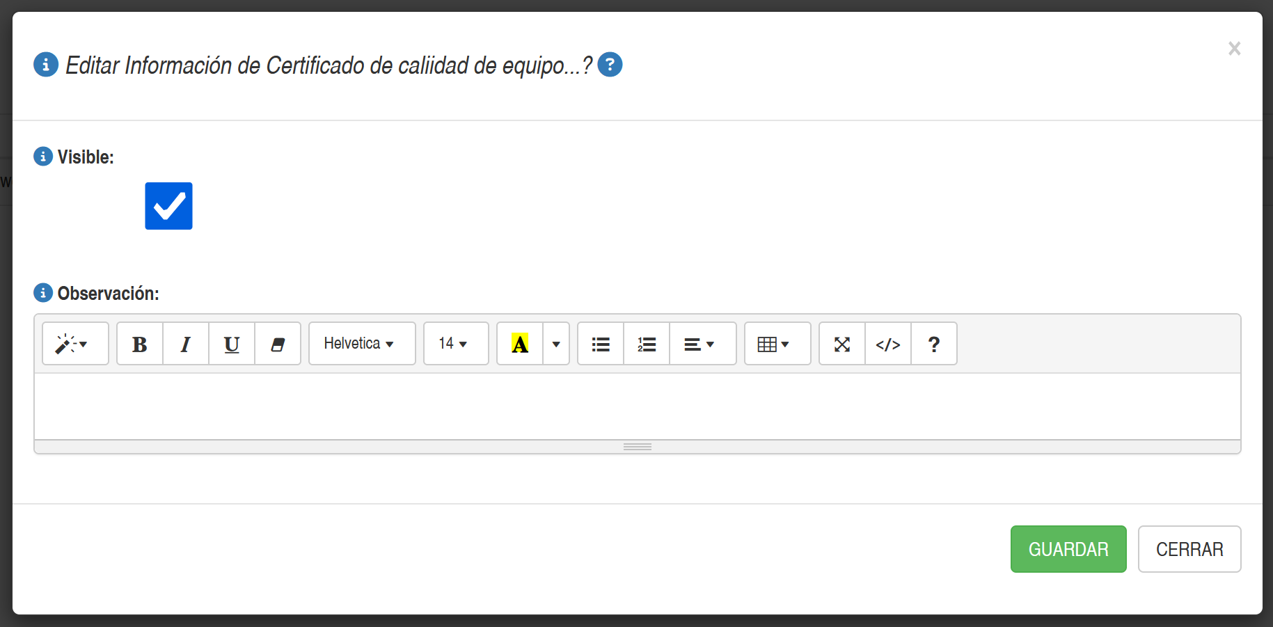 Al seleccionar el botón Editar de un determinado certificado que se ha cargado, aparecerá una ventana emergente con un simple formulario que permite editar/modificar información adicional al archivo cargado, tal como se muestra en la imagen a continuación