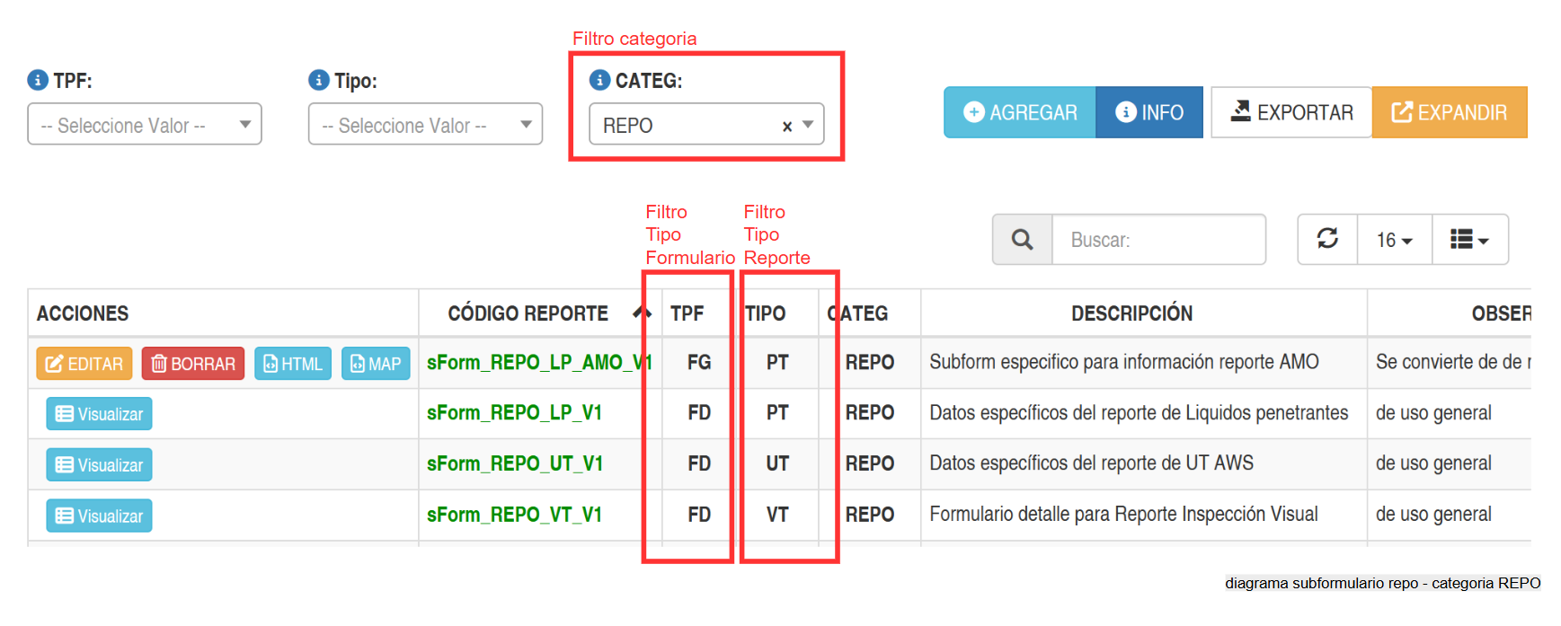 Por tal razón, en configuración hay que cerciorarse que exista un sub formulario de categoría REPO para el tipo de inspección que se va a realizar, esto se verifica en la siguiente imagen