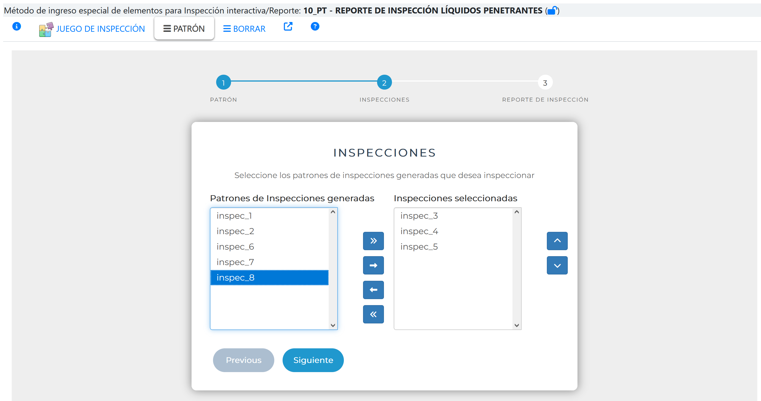 En la medida que se defina elementos en la lista de inspecciones seleccionadas, se activará el botón siguiente.