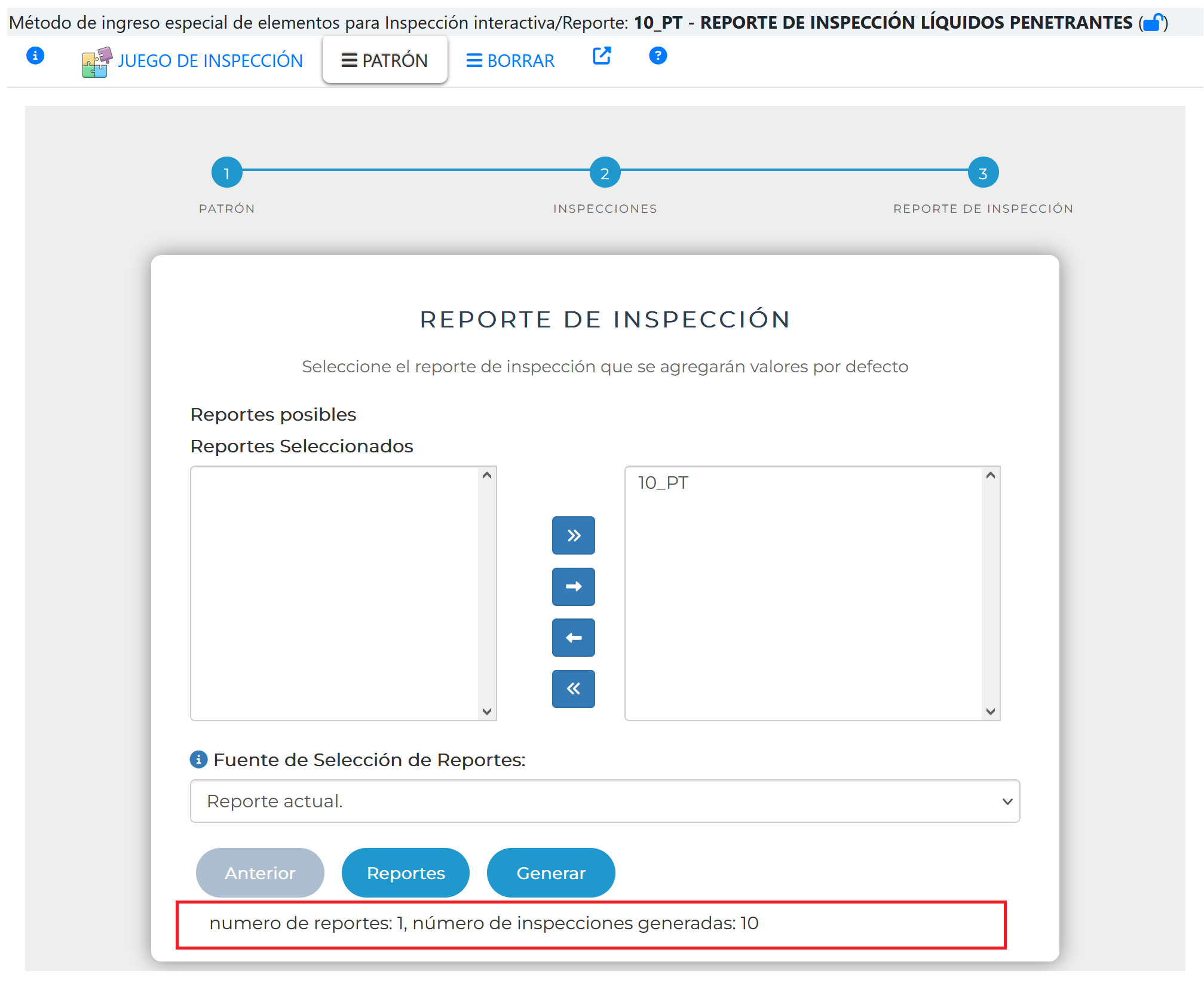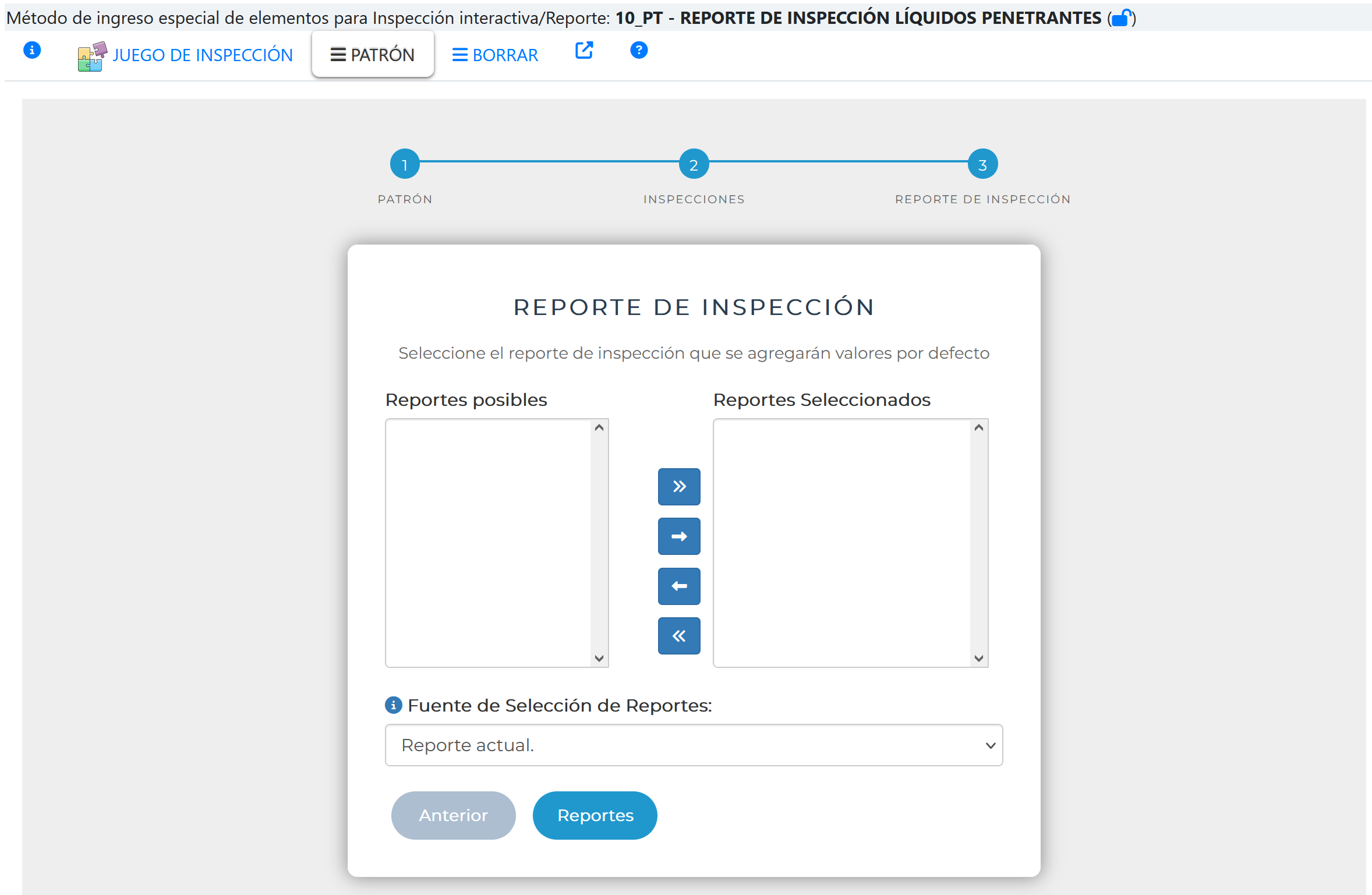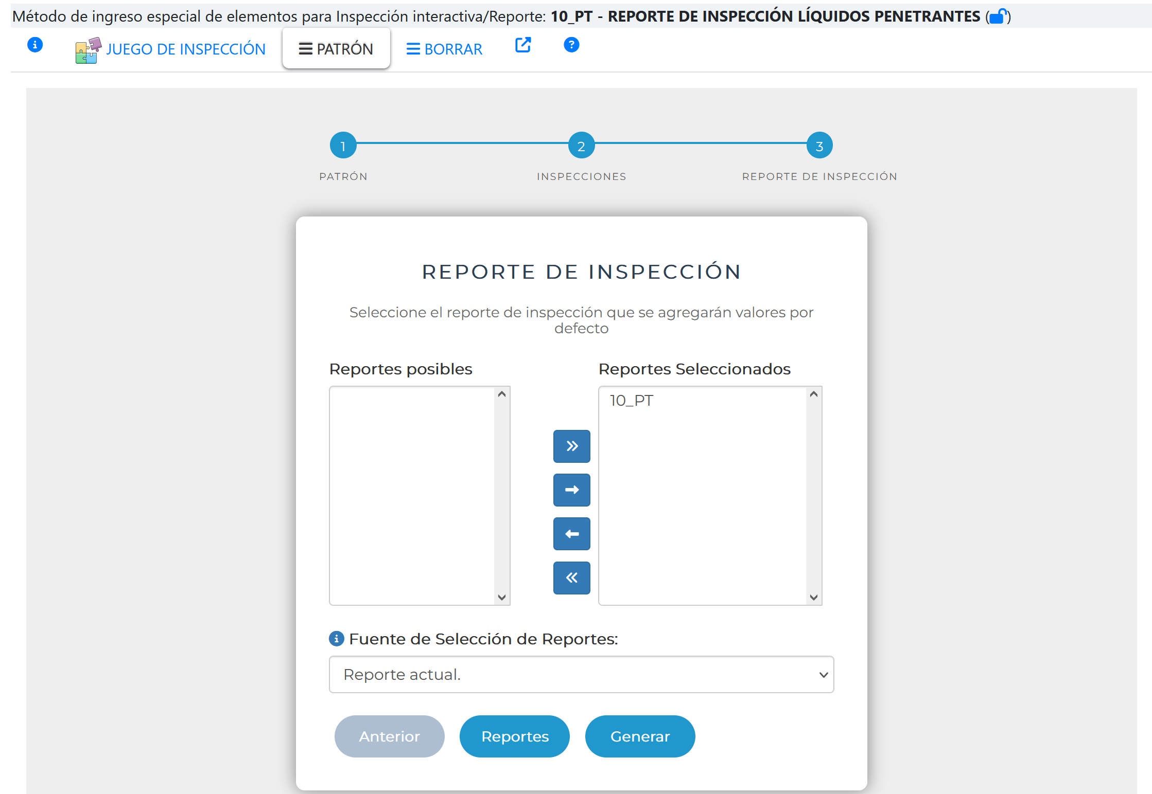 En la primera página se selecciona el juego de inspección que se pretende usar como referencia en este reporte. Recordar que el juego de inspección debe definirse previamente (ver Juego de Inspección).