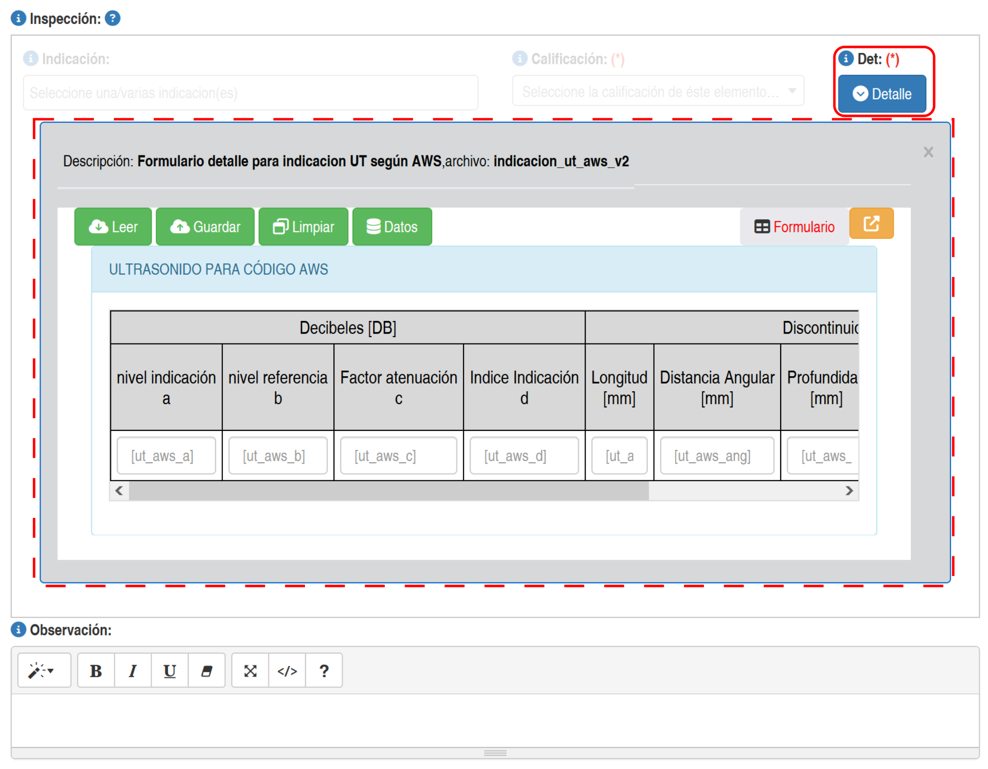 Al presionar el botón Detalle se activará una ventana que muestra un sub-formulario asociado al tipo de archivo que se esté usando. En este caso, para un reporte del tipo UT se activará el sub formulario asociado a esta inspección, tal como se muestra en la siguiente imagen.