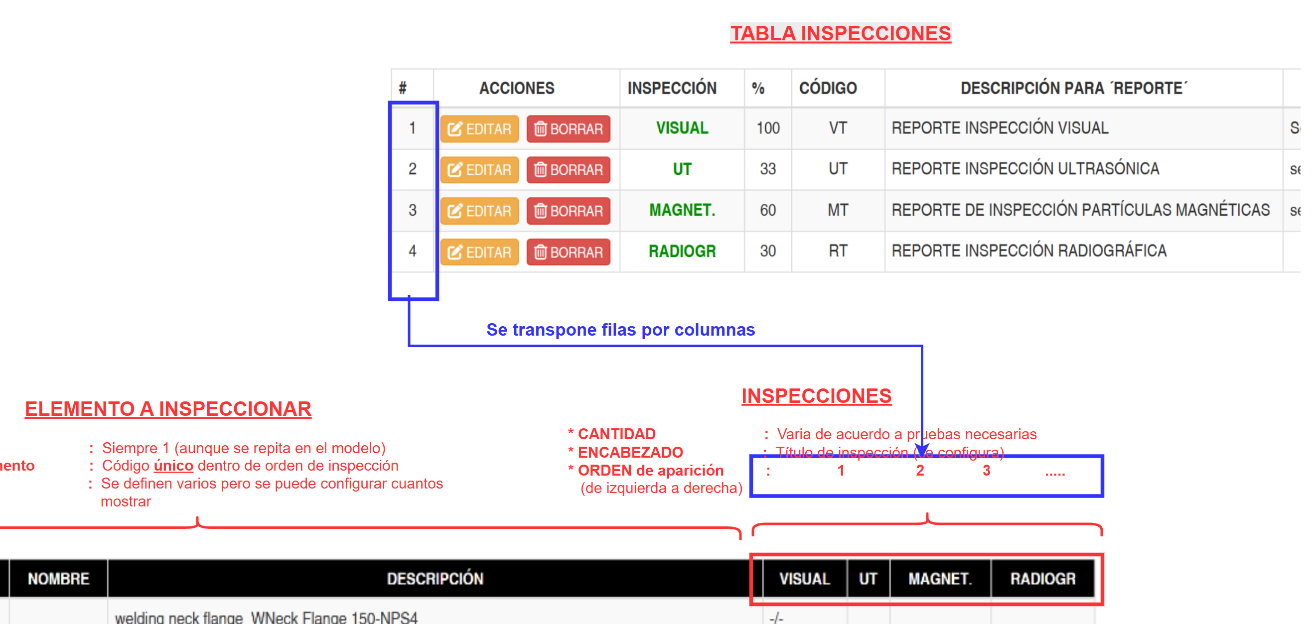 Importante destacar que la información de las inspecciones se transpondrá (filas se cambian por columnas) en el plan de inspección de acuerdo al orden que se defina esta inspección. Esto se muestra en la siguiente imagen